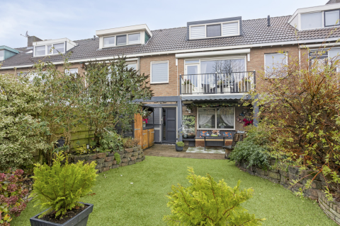 In de achtertuin bevindt zich een vrijstaande houten berging. Deze biedt praktische opbergruimte voor fietsen, tuingereedschap en overige spullen, waardoor de tuin netjes en overzichtelijk blijft.